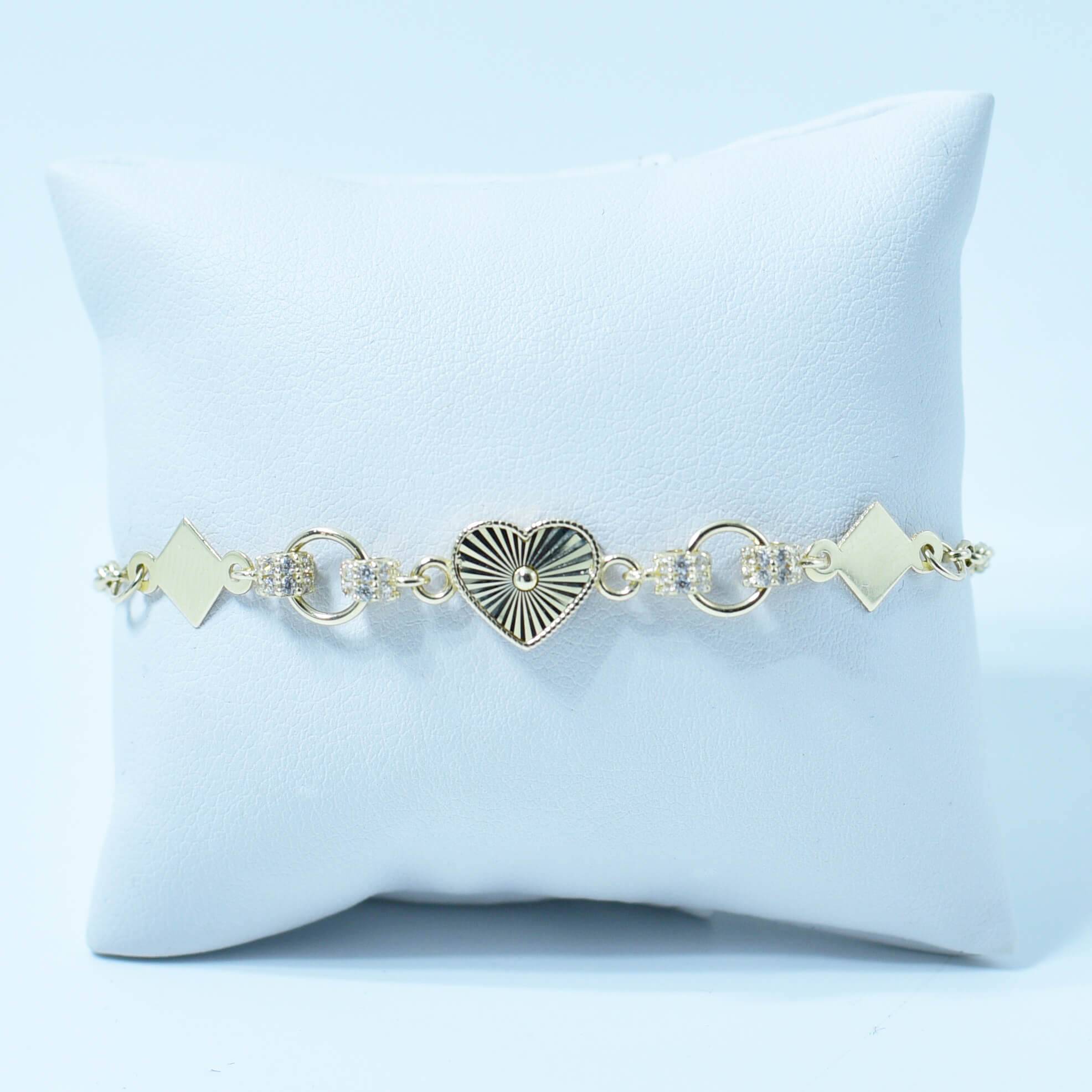 Brățară din aur galben 14K, model Éclat cu forme geometrice și inimă centrală decorată cu pietre de zirconiu, gramaj 4g, lungime 20cm – un mix între stil delicat și strălucire discretă.