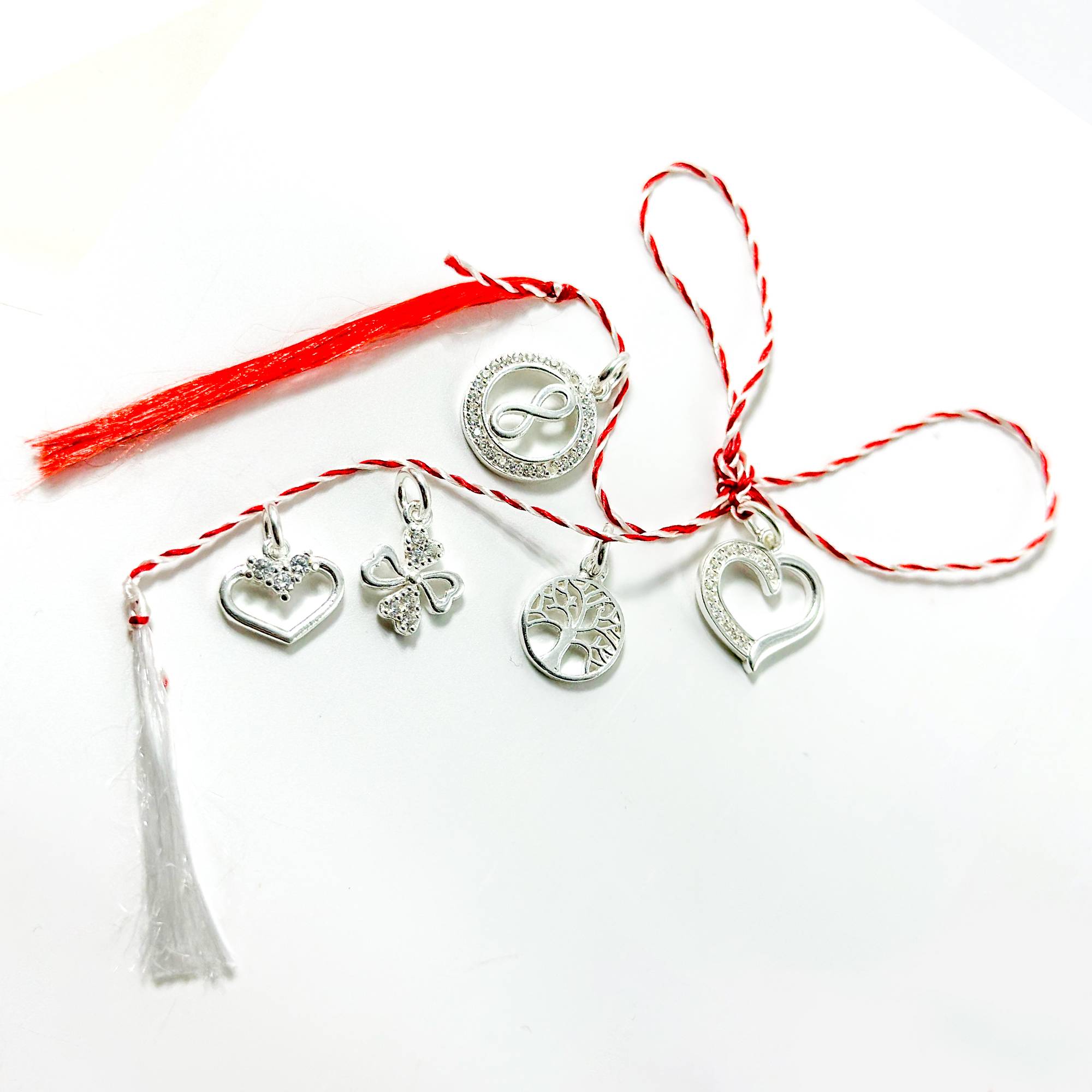 Set de 5 mărțișoare din argint 925, cu pandantive simbolice – copacul vieții, infinit, inimă și trifoi cu zirconiu, livrate cu șnur tradițional!