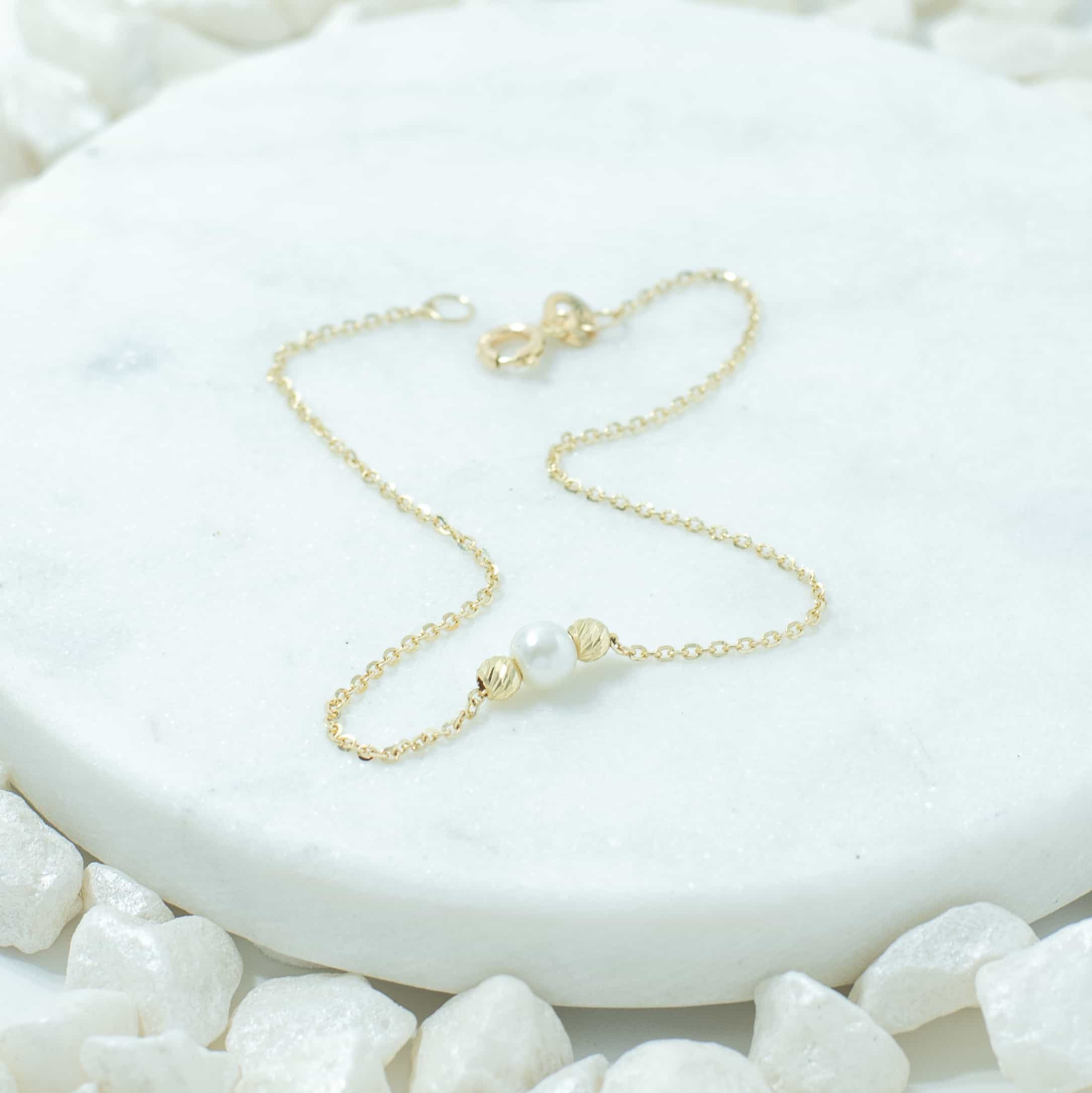 Brățara completează perfect look-ul, având aceleași detalii: perlă de 6 mm și două biluțe aurii de 4 mm. Este realizată din aur galben 14K (585), are o lungime de 18 cm și cântărește 1 gram, fiind delicată, dar vizibilă.