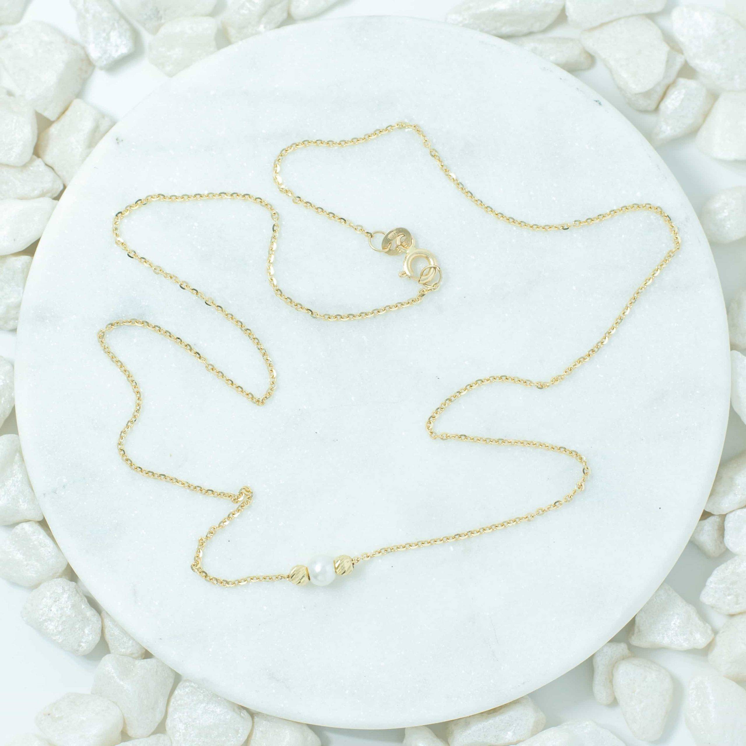 Lănțișorul are o perlă centrală de aproximativ 6 mm și două biluțe din aur de 4 mm, care adaugă strălucire discretă și eleganță fiecărei mișcări. Cu o lungime de 42 cm și o greutate de 1.5 grame, este suficient de fin pentru purtarea zilnică, dar și suficient de special pentru evenimente mai elegante.